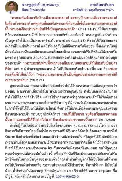 สารศิษยาภิบาล 30 พฤศจิกายน 2025